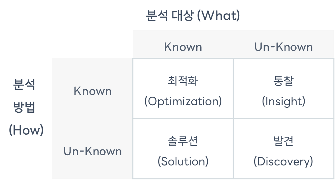 | Unknown | Unknown | Discovery | 분석 대상과 방법 모두 모르는 경우 발견 중심 분석 |